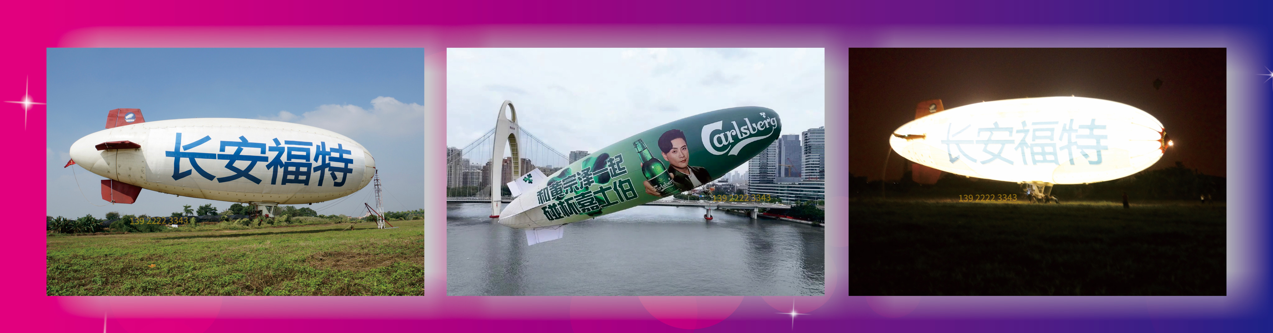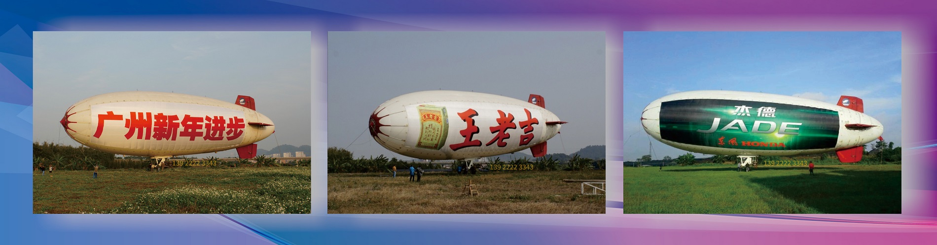 飞艇广告飞行价格:50,000元/小时;飞行方式: 日航/夜航 ;广告幅制作费用: 3万元/2幅