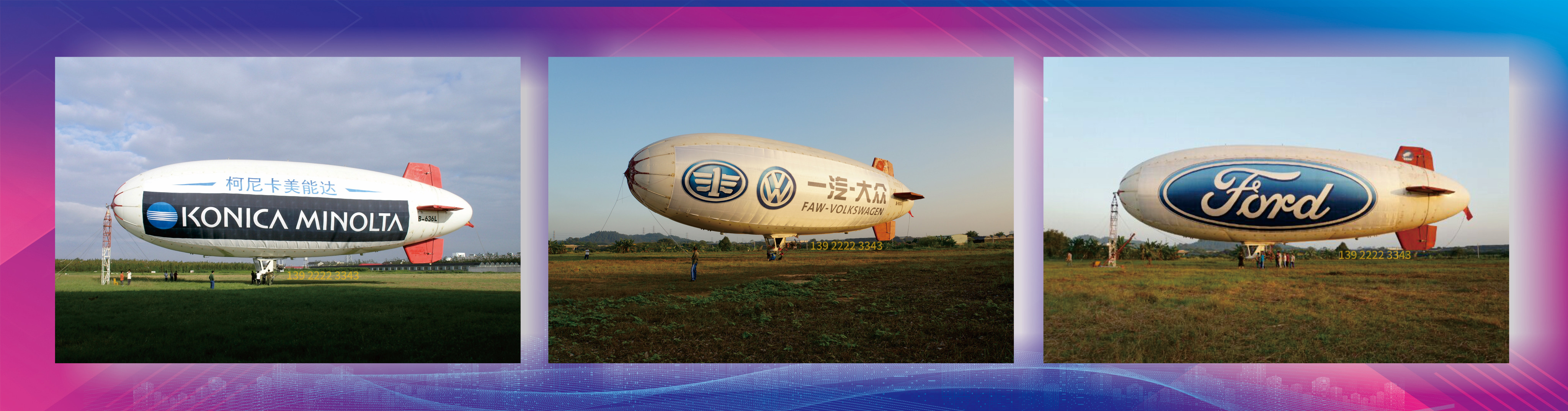 白浅飞艇广告拥有专业的飞艇制造公司,飞艇航空公司,飞艇广告公司,在全国范围广泛飞行,曾服务过保时捷、一汽大众、奥迪、长安福特、一汽马自达、东风本田、东风日产、三星、柯尼卡、王老吉、雅居乐、星河湾、广发银行、中国人寿、嘉士伯、时代地产等。